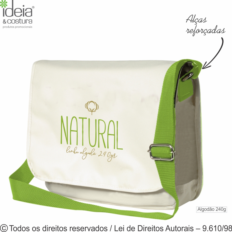 Bolsa de lona natural 235g 32cm de largura x 27cm de altura x 8cm de lateral e profundidade - Diferenciais: lavável, durável, alça reforçada de cadarço de nylon com 160cm com regulador de altura, acabamento com viés na aba, aba para fechamento com botão magnético, divisão interna, prática, útil para distribuição de material didático em congressos e cursos, versátil uso unissex. Pedido mínimo 100 unidades.