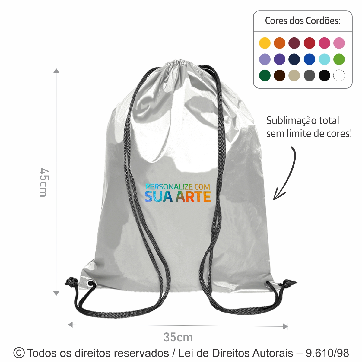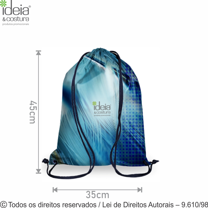 Mochila de poliester 301 medidas: 35cm largura x 45cm de altura diferenciais: fechamento com cordão de nylon duplo de nylon trançado e detalhe, reforço em ilhós para passar cordão. O cliente escolhe a cor da mochila e do cordão