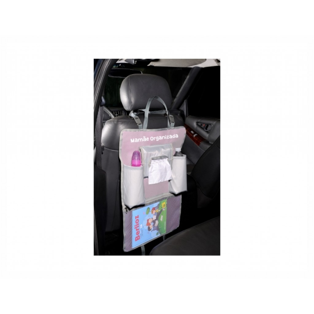 Organizador de carro em nylon 600g, medidas: 40cm largura x 58cm de comprimento (aberto) - Diferenciais: alça para encaixar no encosto com regulador de tamanho, alças para retirar do carro com praticidade. Bolsos em nylon resinado, acabamento com viés nas bordas, 2 compartimentos para garrafinhas ou mamadeiras, um porta lencinhos, um bolso de tela com fechamento em zíper para brinquedos, livros, tablet, ou lanche. O cliente escolhe a cor que deseja. Pedido mínimo 50 peças.