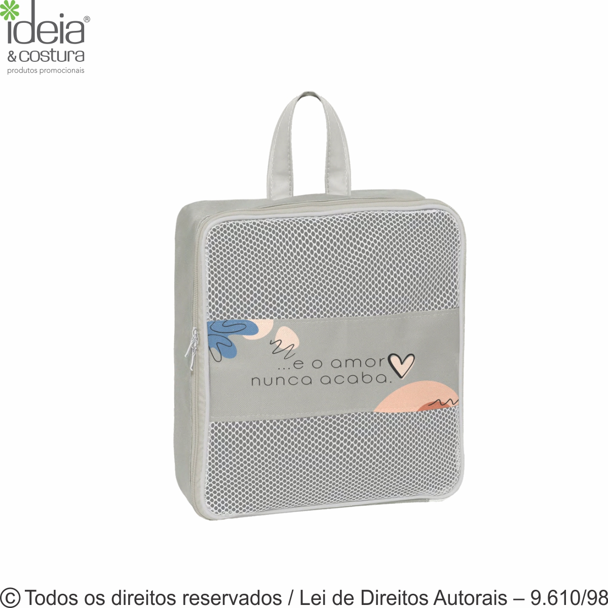 Organizador de Cordoba medidas: 23cm largura x 27cm comprimento x 9cm de lateral e profundidade - Diferenciais: aba para fechamento com tela, acabamento com vivo nas bordas, fechamento com zíper e dois cursores, faixa para personalização, alça do mesmo tecido. Organiza gavetas, armário ou mala. Pedido mínimo 100 peças.