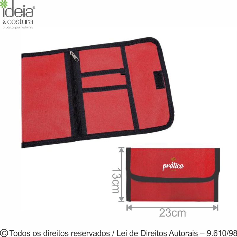Porta documentos de viagem em nylon 600g medidas: aberto 34cm de largura x 23cm de altura - fechado 23cm x 13cm - Diferenciais: acabamento com viés, fechamento com velcro, compartimento com zíper e espaço para caneta. Pedido mínimo 100 peças.