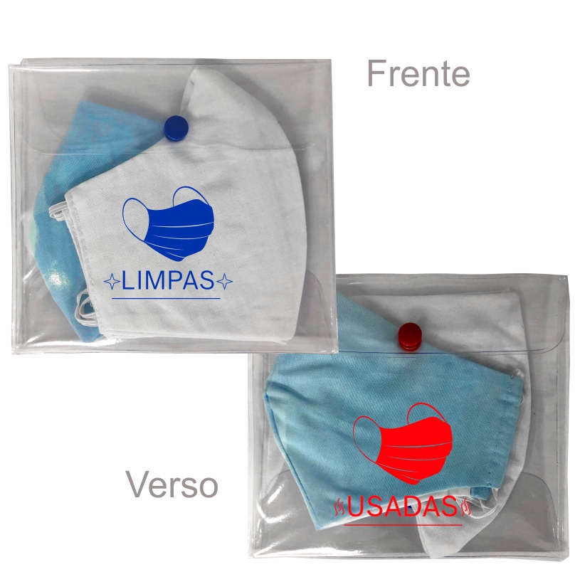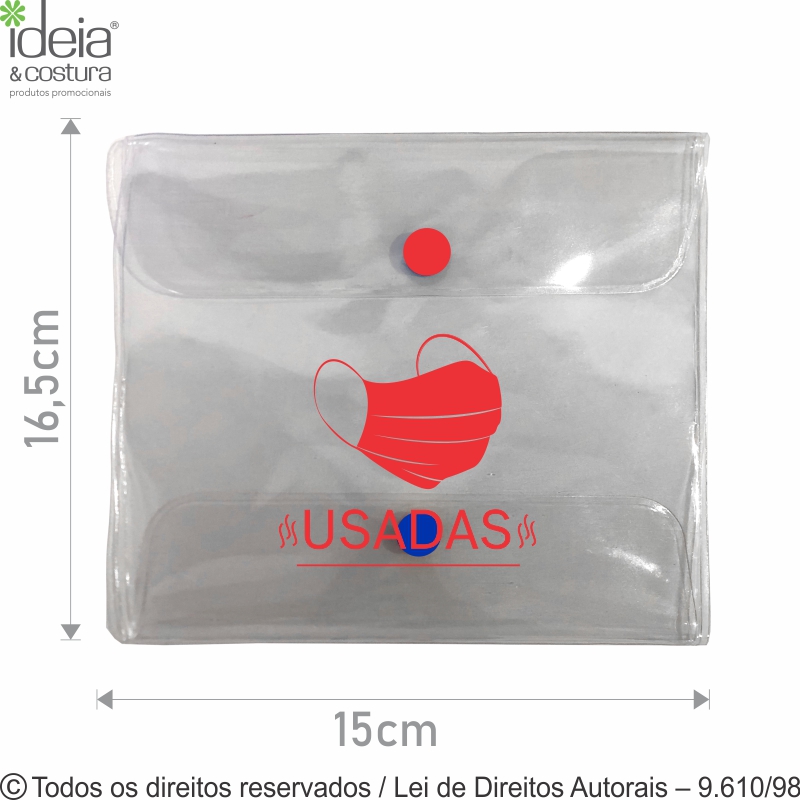 Porta máscara de pvc transparente medidas: 16,5cm de largura x 15cm de altura. Confeccionada em pvc cristal, fechamento dos compartimentos com botão de pressão, dois compartimentos para levar máscaras limpas e usadas separadamente, pode ser higienizado. Suas máscaras não entram em contato com outros objetos na bolsa.