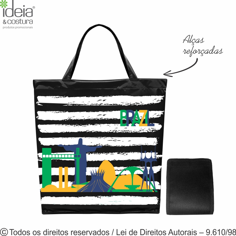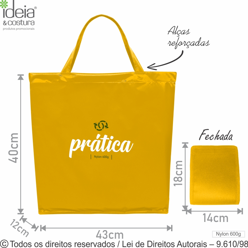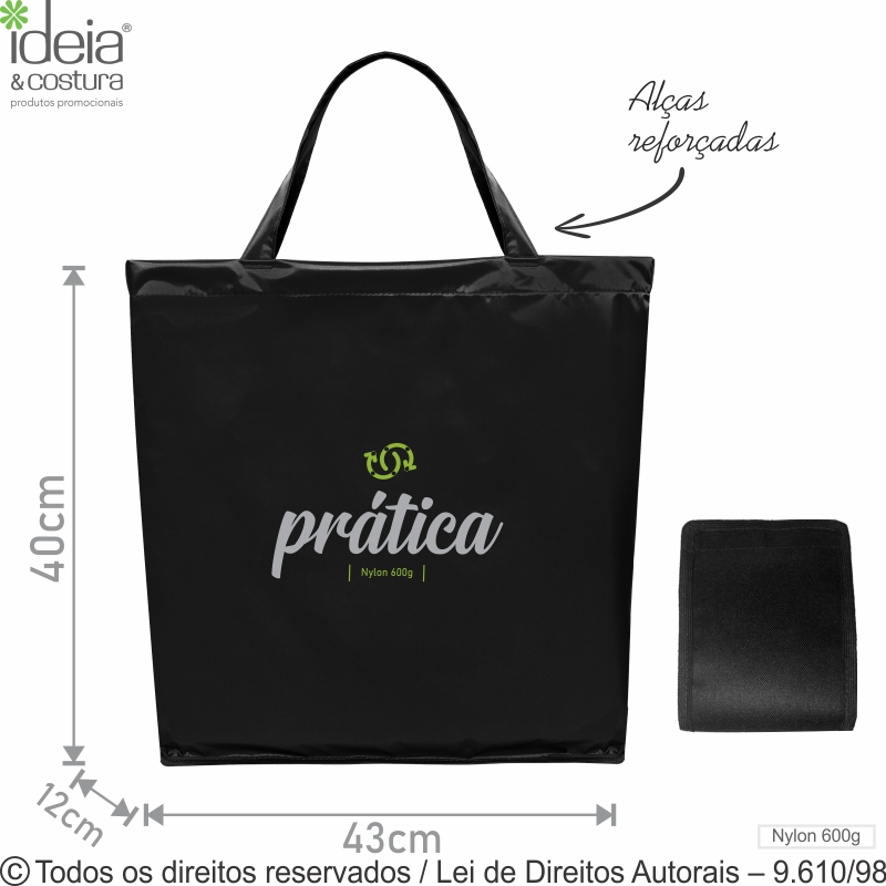 Sacola de nylon resinado dobrável medidas: 43cm de largura x 40cm de altura x 12cm de profundidade - Diferencias: fundo e alças reforçadas, a sacola dobra e fecha com o velcro podendo ser guardada na bolsa com mais praticidade, tenha sempre a mão uma ecobag. Pedido mínimo 100 unidades.