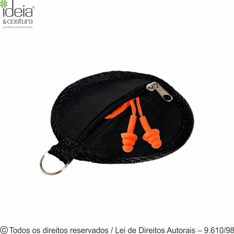 Porta fone de ouvido, porta protetor auricular, de nylon 600g,medidas: 12,5 de diâmetro, fechamento com zíper, argola de metal e acabamento com viés. Pedido mínimo 100 unidades.