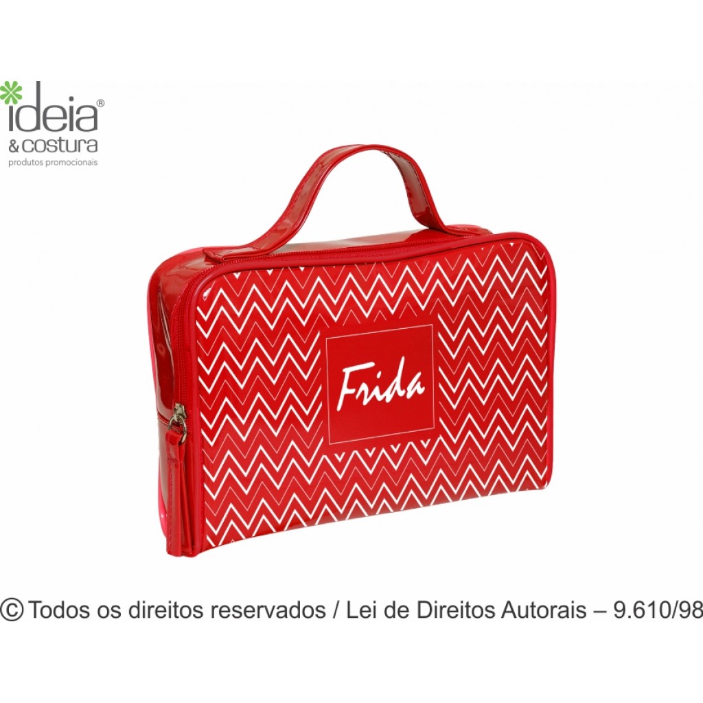 Necessaire de verniz 23cm de largura x 16cm de altura x 6cm de lateral e profundidade. Acabamento com vivo nas bordas,alca de mão, fechamento com zíper, cursor especial e alcinha adicional. O cliente escolhe a cor da necessaire do vivo e do zíper.