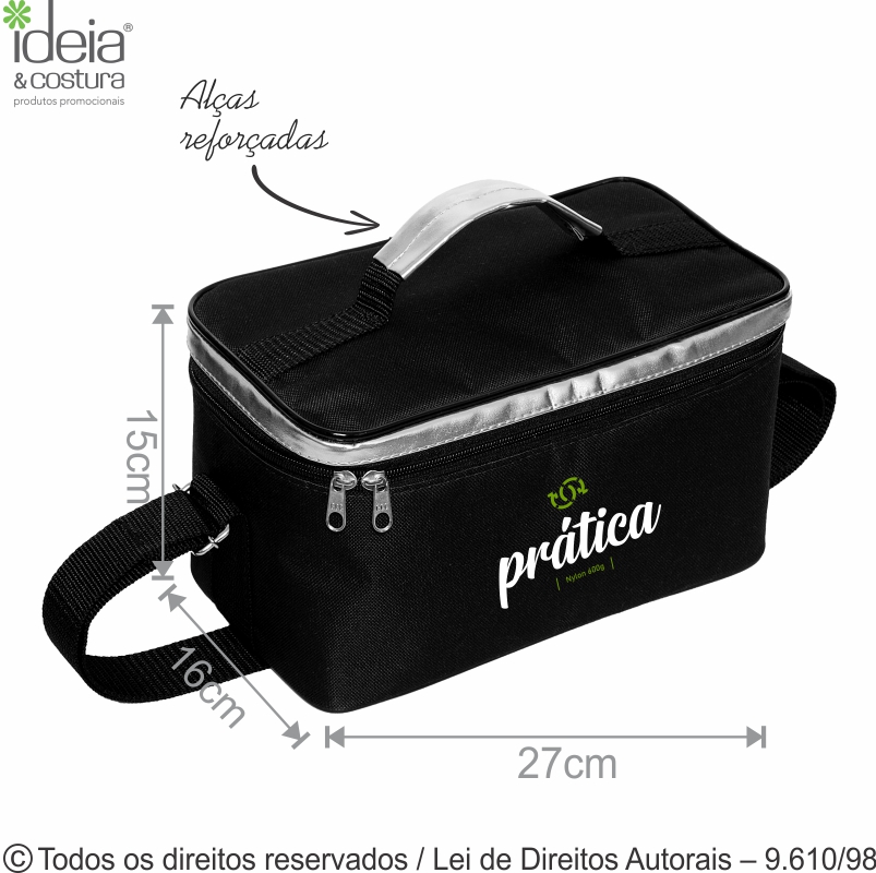 Bolsa térmica de nylon medidas: 27cm de largura x 15cm de altura x 16cm de lateral e profundidade. Alça de mão com munhequeira, alça tiracolo regulável, fechamento com zíper. Detalhe em tecido sintético dourado, prateado ou outras cores. Pedido mínimo 100 unidades.