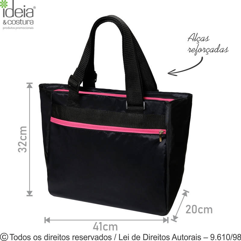Bolsa de nylon plastificado medidas: 41cm de largura x 32cm de altura x 20cm de lateral e profundidade. A aba para fechamento com zíper, bolso frontal com zíper, alças de cadarço de nylon trançado com 4cm e regulador de altura. O cliente escolhe a cor da bolsada alça e do zíper.