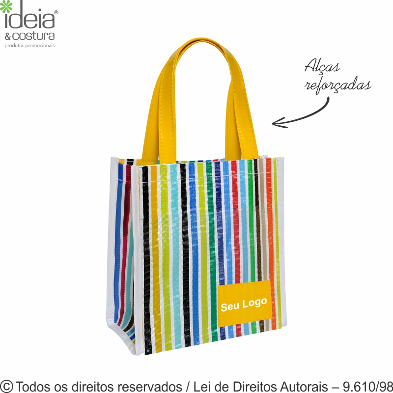Sacola de tela de nylon listada 22cm de largura x 26cm de altura x 12cm de lateral e profundidade, acabamento com vies nas laterais, alça de mao em vernis, etiqueta para impressão do logo. O cliente escolhe a cor das listas bicolor na cartela de opçoes disponível a partir de 1.000 unidades abaixo desta quantidade são cores sortidas.