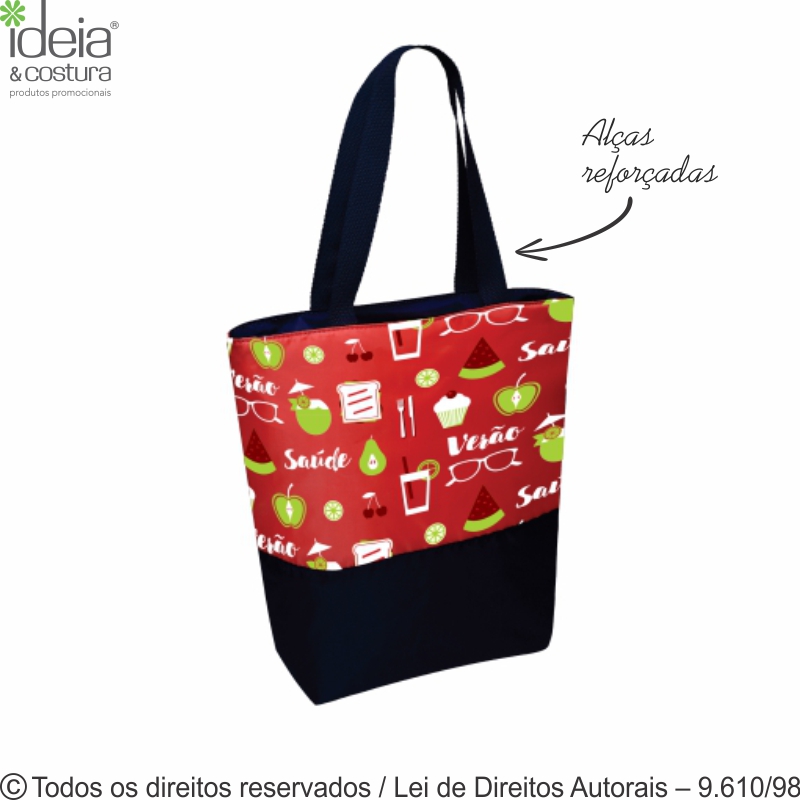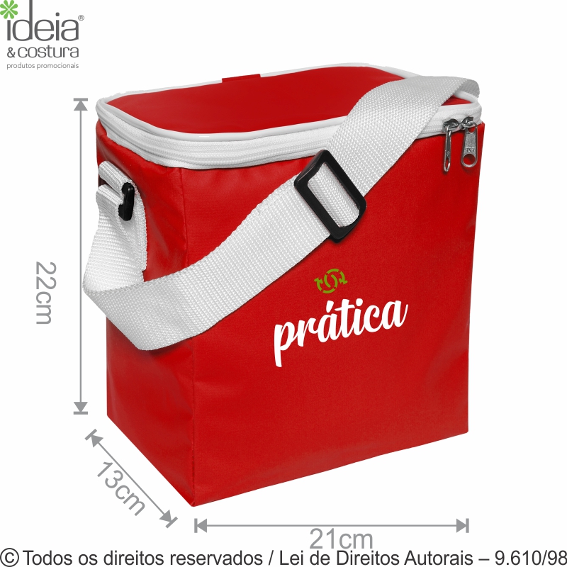 Bolsa térmica medidas: 21cm de largura x 22cm de altura x 13cm de lateral e profundidade, acabamento na aba com vivo, fechamento com zíper e dois cursores, alça com regulador. O cliente escolhe a cor da bolsa. Pedido mínimo 100 unidades.
