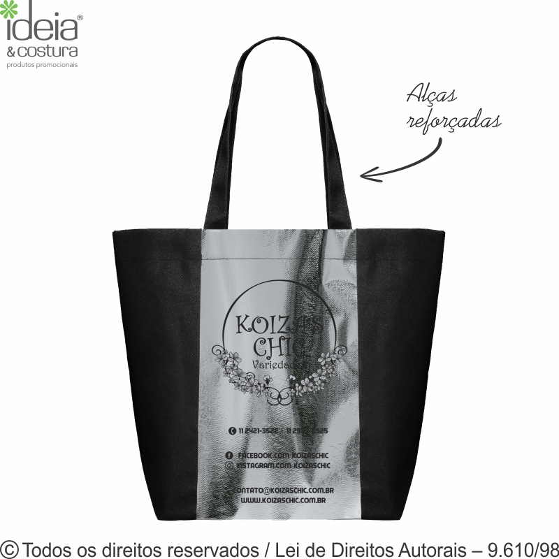 Sacola de TNT comum 60g com detalhe em TNT metalizado medidas: 43cm de largura x 37cm de altura x 10cm profundidade - Diferenciais: alças reforçadas, modelos exclusivo que proporciona mais destaque em eventos com custo mais econômico. Consulte sobre as cores. Pedido mínimo 100 unidades.